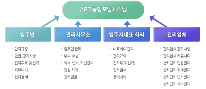 - 입주자정보 관리(전출,전입), 소유주관리, 관리비 및 장기수선충당금 관리, 주차관리(차량관리) |
