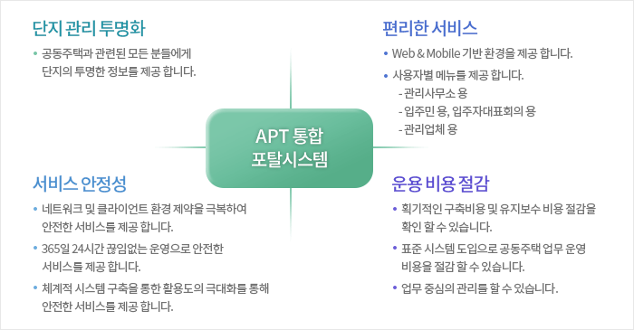 검증된 공동주택 ERP시스템과 새로운 통합 포탈 시스템을 통해 한 단계 더 나아갈 수 있는 관리환경을 만들어 고객 여러분께 제공하도록 하겠습니다